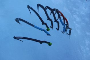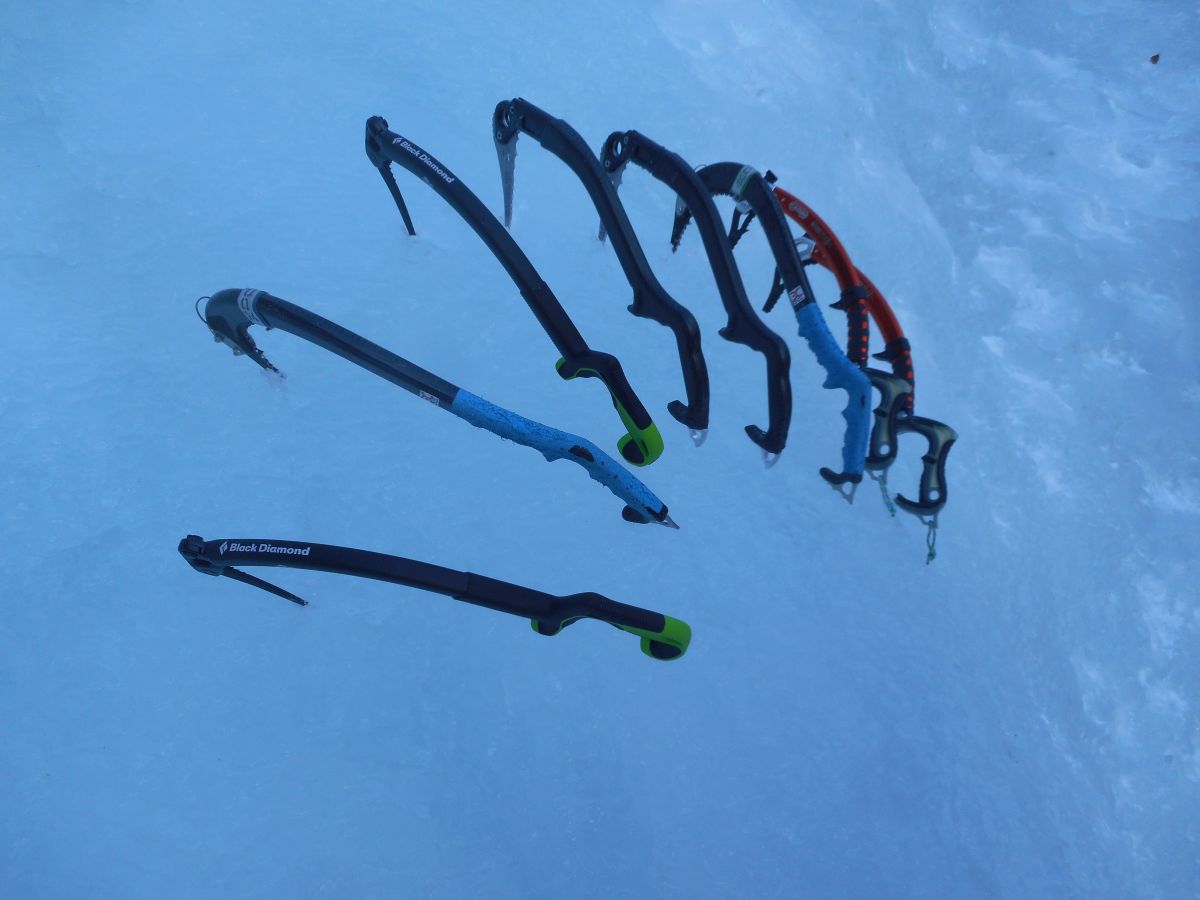 -Attrezzatura alpinistica: imbragatura, casco da alpinismo, scarponi rigidi, ramponi a 12 punte con attacco rapido, due piccozze a lama curva (banana), cordini e moschettoni a ghiera.